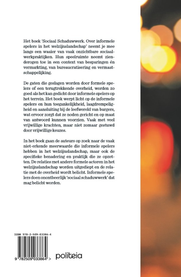 In het boek gaan de auteurs op zoek naar de vaak niet-erkende meerwaarde die informele spelers hebben in het welzijnslandschap, maar ook de specifieke benadering en praktijk die ze opzetten. De relaties met andere formele actoren in het welzijnslandschap worden uitgediept en de relatie met de overheid wordt belicht. Informele spelers doen onontbeerlijk ‘sociaal schaduwwerk’ dat mag belicht worden.