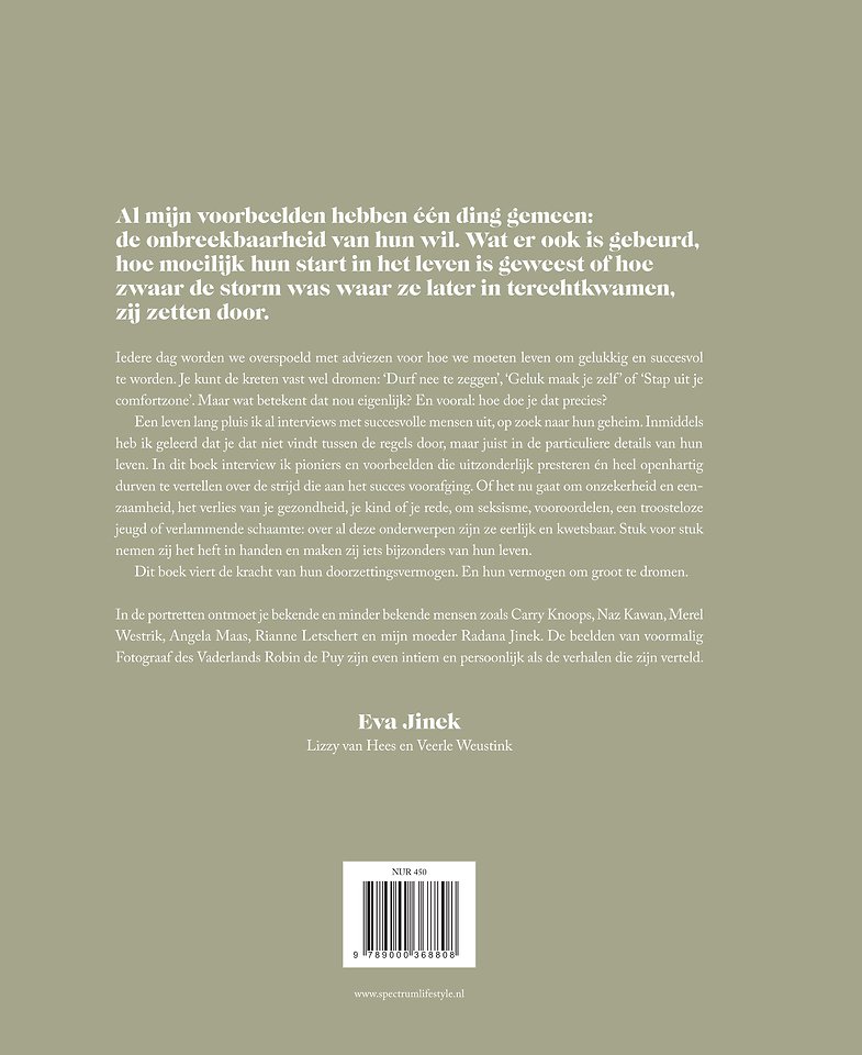 Meer over Eva JinekEva Jinek interviewt in Droom groot haar selectie van pioniers en rolmodellen die uitzonderlijk presteren én bereid zijn om te vertellen welke strijd daaraan voorafging. Of het nu gaat om onzekerheid en eenzaamheid, het verlies van je gezondheid, je kind of je rede, seksisme, vooroordelen, een troosteloze jeugd of verlammende schaamte: over dit alles zijn ze kwetsbaar en eerlijk. Juist door de particuliere details van hun levens op te schrijven, maakt Eva duidelijk wat wij allemaal van ze kunnen leren. Een ding hebben ze gemeen: de onbreekbaarheid van hun wil. Dit boek viert de kracht van hun doorzettingsvermogen.