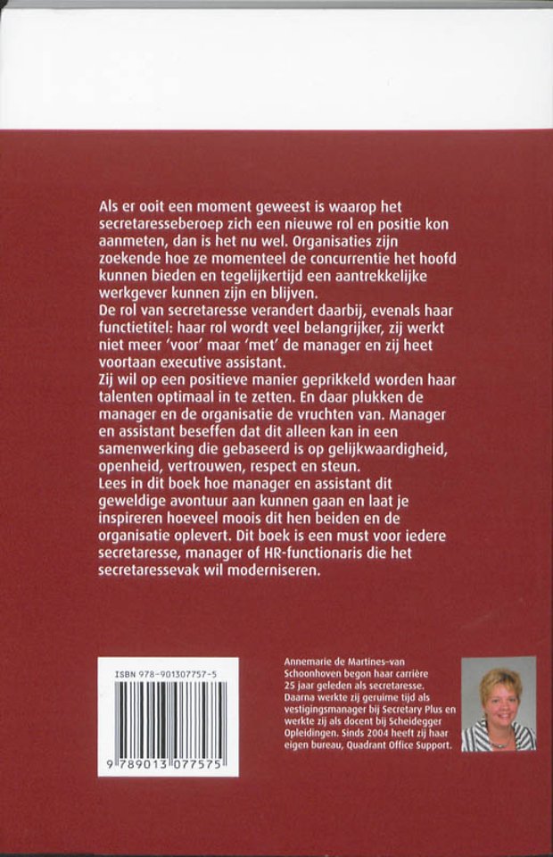 Als er ooit een moment geweest is waarop het secretaresseberoep zich een nieuwe rol en positie kon aanmeten, dan is het nu wel. Organisaties zijn zoekende hoe ze momenteel de concurrentie het hoofd kunnen bieden en tegelijkertijd een aantrekkelijke werkgever kunnen zijn en blijven. De rol van secretaresse verandert daarbij, evenals haar functietitel: haar rol wordt veel belangrijker, zij werkt niet meer 'voor' maar 'met' de manager en zij heet voortaan executive assistant. Zij wil op een positieve manier geprikkeld worden haar talenten optimaal in te zetten. En daar plukken de manager en de organisatie de vruchten van. Manager en assistant beseffen dat dit alleen kan in een samenwerking die gebaseerd is op gelijkwaardigheid, openheid, vertrouwen, respect en steun. Lees in dit boek hoe manager en assistant dit geweldige avontuur aan kunnen gaan en laat u inspireren hoeveel moois dit hen beiden en de organisatie oplevert. Dit boek is een must voor iedere secretaresse, manager of HR-functionaris die het secretaressevak wil moderniseren.