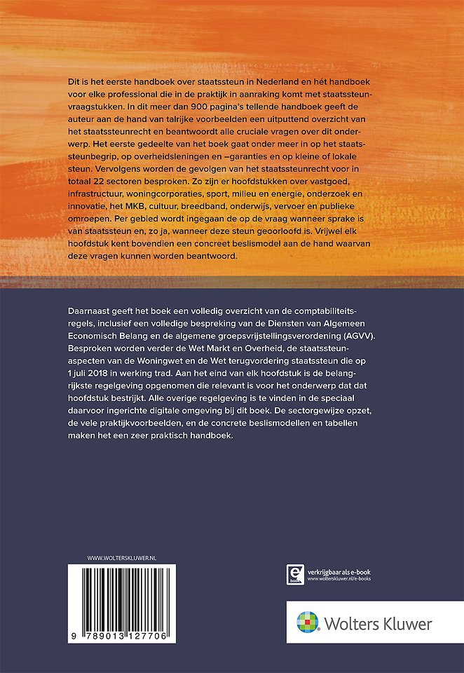 Dit is het eerste handboek over staatssteun in Nederland en hét handboek voor elke professional die in de praktijk in aanraking komt met staatssteunvraagstukken. Aan de hand van talrijke voorbeelden wordt een volledig overzicht gegeven van het staatssteunrecht en worden alle cruciale vragen over dit onderwerp beantwoord.