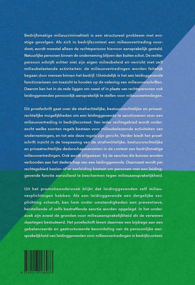 Geeft een compleet overzicht van de strafrechtelijke, bestuursrechtelijke en privaatrechtelijke vereisten voor de milieuaansprakelijkheid van leidinggevenden. Zowel de gronden voor aansprakelijkheid als de verweren daartegen komen aan bod. Dit proefschrift bespreekt stapsgewijs de daderschapsvormen en aansprakelijkheidsvereisten. Tevens wordt er stilgestaan bij de sancties die worden verbonden aan het daderschap van een leidinggevende.