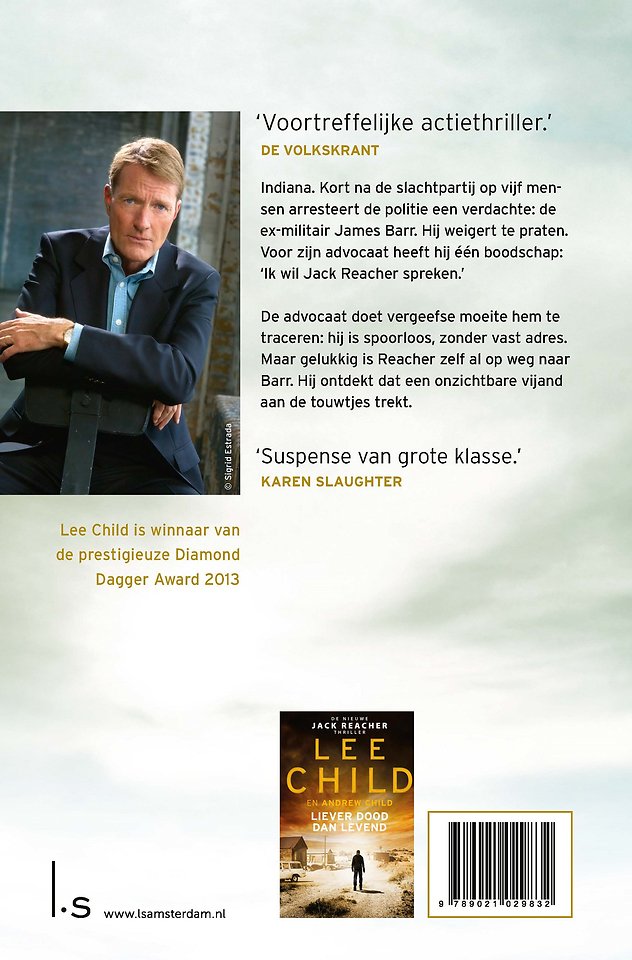 Lee Child is winnaar van de prestigieuze Diamond Dagger Award 2013. In 2017 werd hij gekroond tot ThrillerMaster door de International Thriller Writers. Zijn Jack Reacher-serie, gepubliceerd in 47 talen, is met ruim honderd miljoen verkochte exemplaren volgens Forbes Magazine het sterkste boekenmerk ter wereld.