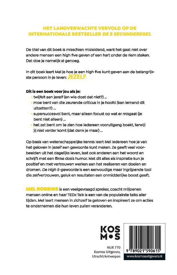 Op basis van wetenschappelijke feiten leert Mel iedereen hoe je van het geloven in jezelf een gewoonte kunt maken. Zo kun je met vertrouwen werken aan het realiseren van doelen en dromen. 'De High 5 gewoonte' is een eenvoudige maar ingrijpende tool die zelfvertrouwen, geluk en resultaten een onmiddellijke boost geeft.