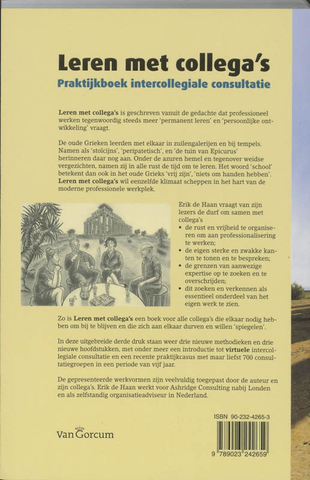 De oude Grieken leerden met elkaar in zuilengalerijen en bij tempels. Namen als 'stoïcijns', 'peripatetisch' en 'de tuin van Epicurus' herinneren daar nog aan. Onder de azuren hemel en tegenover weidse vergezichten, namen zij in alle rust de tijd om te leren. Het woord 'school' betekent dan ook in het oude Grieks 'vrij zijn', niets om handen hebben. 'Leren met collega's' wil een zelfde klimaat scheppen in het hart van de moderne professionele werkplek.