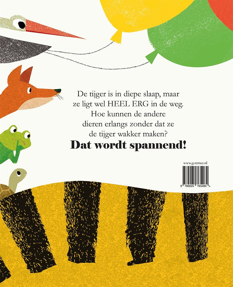 Ssst! De tijger slaapt en we willen haar niet wakker maken. Er is alleen een probleem: alle dieren moeten erlangs en ze ligt vreselijk in de weg. Hoe gaan ze dat oplossen? Gelukkig heeft de slimme kikker een idee: alle dieren zweven een voor een met een ballon over de tijger heen.