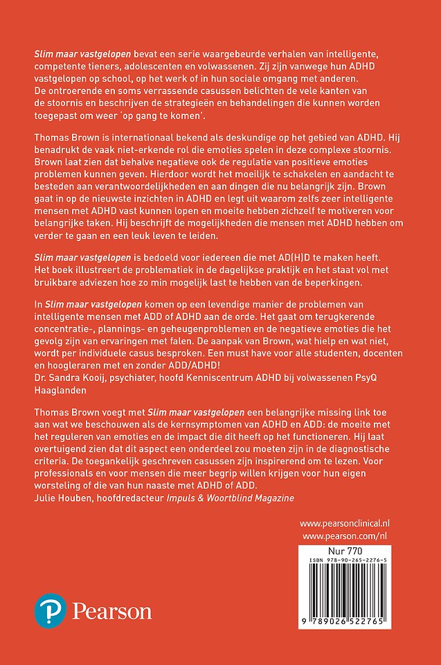 'Thomas Brown voegt met Slim maar vastgelopen een belangrijke missing link toe aan wat we beschouwen als de kernsymptomen van ADHD en ADD: de moeite met het reguleren van emoties en de impact die dit heeft op het functioneren. Hij laat overtuigend zien dat dit aspect een onderdeel zou moeten zijn in de diagnostische criteria. De aantal toegankelijk geschreven casussen zijn inspirerend om te lezen. Voor professionals en voor mensen die meer begrip willen krijgen voor hun eigen worsteling of die van hun naaste met ADHD of ADD.'
