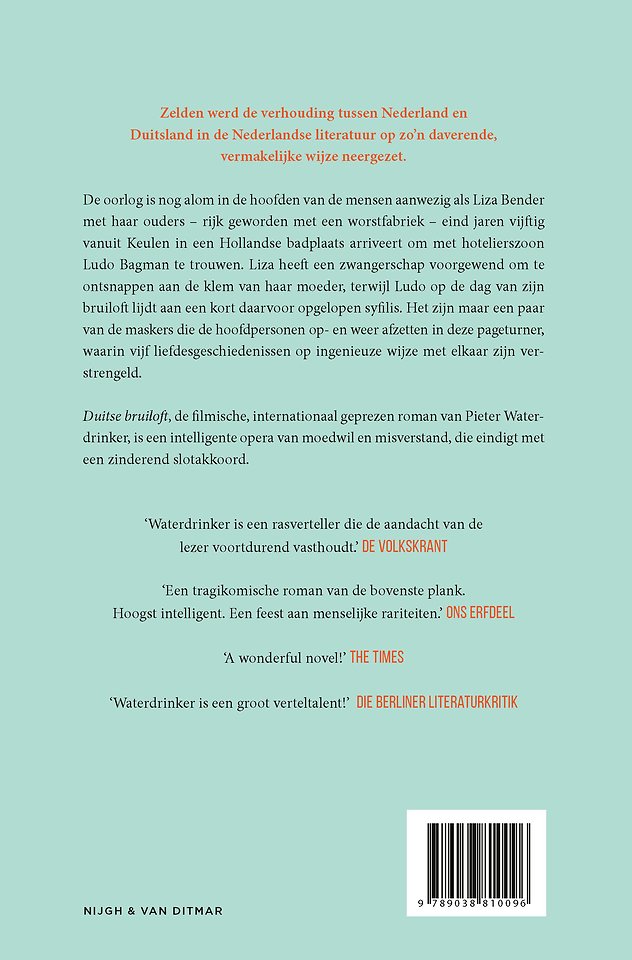 Duitse bruiloft, de filmische, internationaal geprezen roman van Pieter Waterdrinker, is een intelligente opera van moedwil en misverstand, die eindigt met een zinderend