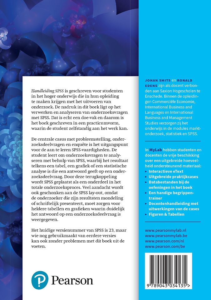 Handleiding SPSS is geschreven voor studenten in het hoger onderwijs die in hun opleiding te maken krijgen met het uitvoeren van onderzoek. De nadruk in dit boek ligt op het verwerken en analyseren van onderzoeksvragen met SPSS. Dat is echt een doe-vak en daarom is het boek geschreven in een practicumvorm, waarin de student zelfstandig aan het werk kan.