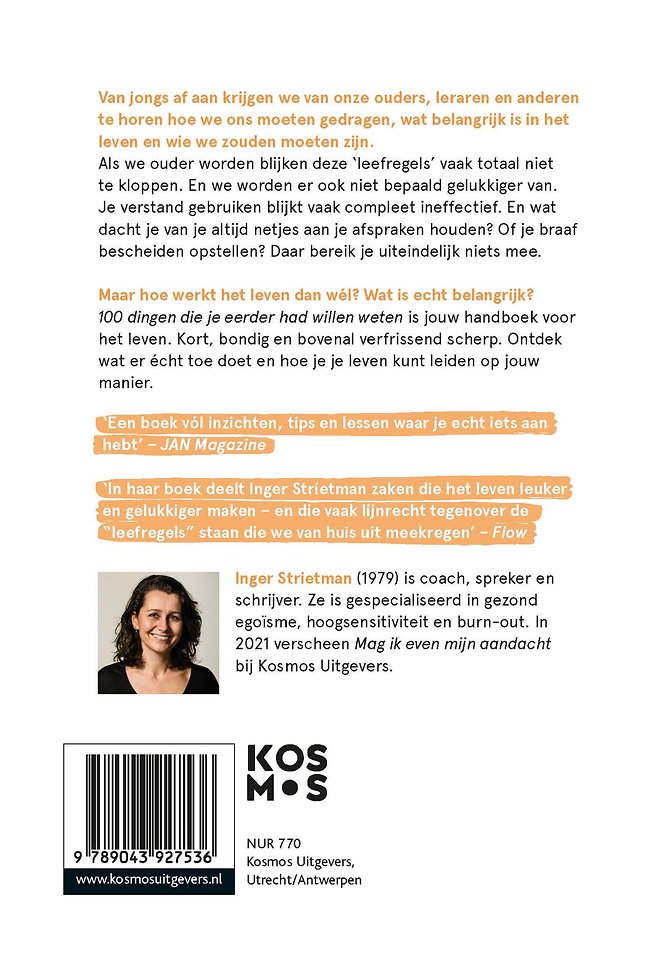 In 100 dingen die je eerder had willen weten legt Inger Strietman uit hoe het leven nu eigenlijk echt werkt. Van jongs af aan krijgen we van onze ouders, leraren en anderen te horen hoe we ons moeten gedragen en wat belangrijk is in het leven. Om er vervolgens achter te komen dat deze ‘leefregels’ vaak totaal niet kloppen, en ook niet echt gelukkiger maken.
