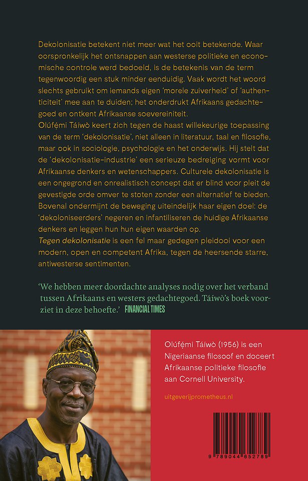 Olúfẹ́mi Táíwò keert zich tegen de haast willekeurige toepassing van de term 'dekolonisatie', niet alleen in literatuur, taal en filosofie, maar ook in sociologie, psychologie en de zorg. Hij stelt dat de 'dekolonisatie-industrie' een serieuze bedreiging vormt voor Afrikaanse denkers en wetenschappers. Culturele dekolonisatie is een ongegrond en onrealistisch concept dat er blind voor pleit de gevestigde orde omver te stoten zonder een alternatief te bieden. Bovenal ondermijnt de beweging uiteindelijk haar eigen doel: de 'dekoloniseerders' negeren en infantiliseren de huidige Afrikaanse denkers, en leggen hun hun eigen waarden op.