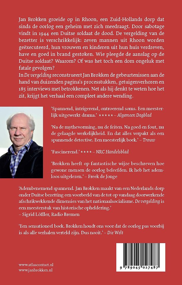 Jan Brokken groeide op in Rhoon, een Zuid-Hollands dorp dat sinds de oorlog een geheim met zich meedraagt. Door sabotage vindt in 1944 een Duitse soldaat de dood. De vergelding van de bezetter is verschrikkelijk: zeven mannen uit Rhoon worden geëxecuteerd, hun vrouwen en kinderen uit hun huis verdreven, have en goed in brand gestoken. Wie pleegde de aanslag op de Duitse soldaat? Waarom? Of was het toch een dom ongeluk met fatale gevolgen? In De vergelding reconstrueert Jan Brokken de gebeurtenissen aan de hand van duizenden pagina's processtukken, getuigenverhoren en 185 interviews met betrokkenen. Net als hij denkt te weten hoe het zit, krijgt het verhaal een compleet andere wending.
