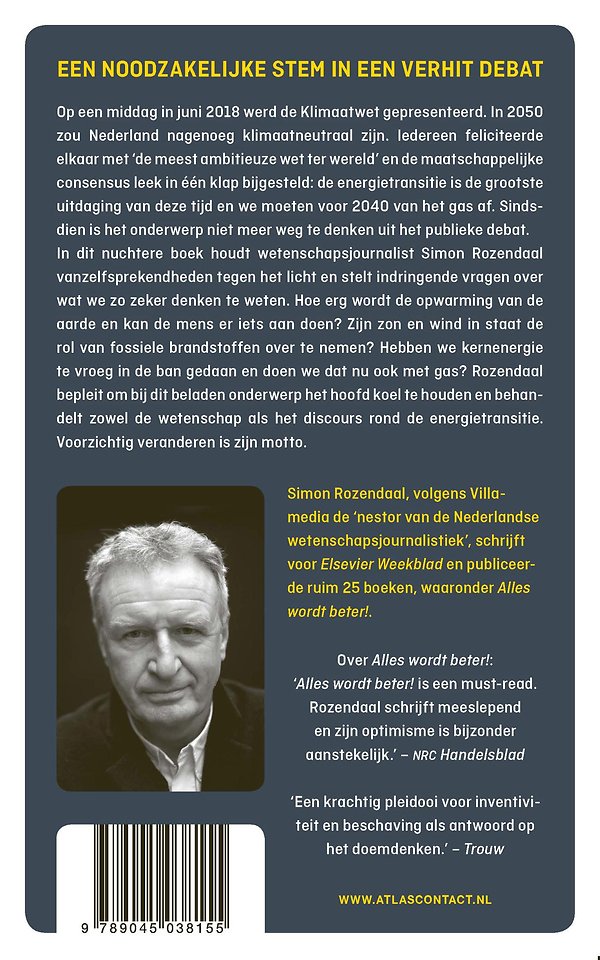 In dit nuchtere boek houdt wetenschapsjournalist Simon Rozendaal deze vanzelfsprekendheden tegen het licht en stelt indringende vragen over wat we zo zeker denken te weten. Hoe erg wordt de opwarming van de aarde en kan de mens er iets aan doen? Zijn zon en wind in staat de rol van fossiele brandstoffen over te nemen? Hebben we kernenergie te vroeg in de ban gedaan en doen we dat nu ook met gas?