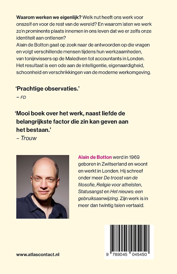 Alain de Botton gaat op zoek naar de antwoorden op die vragen en volgt verschillende mensen tijdens hun werkzaamheden, van tonijnvissers op de Malediven tot accountants in Londen. Het resultaat is een ode aan de intelligentie, eigenaardigheid, schoonheid en verschrikkingen van de moderne werkomgeving, met als opmerkelijke conclusie dat werk, naast liefde, de belangrijkste factor is die zin kan geven aan ons bestaan.