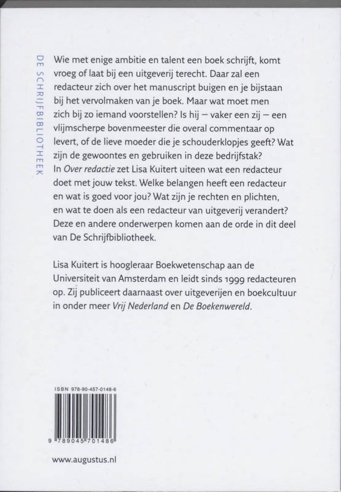 Wie alle richtlijnen en adviezen van De Schrijfbibliotheek netjes heeft opgevolgd, zou in staat moeten zijn de ideale tekst te schrijven. Toch valt er nog altijd aan een manuscript te sleutelen om het beter te maken. Veel mensen laten hun teksten door vrienden of bekenden becommentariëren, maar op een dag ligt je manuscript dan eindelijk op de uitgeverij, bij de redacteur. Wat moet je je bij zo iemand voorstellen? Is hij, of zij, de lieve moeder die je schouderklopjes geeft, of is hij een vlijmscherpe bovenmeester die overal commentaar bij heeft? In dit deel van De Schrijfbibliotheek zet Lisa Kuitert uiteen wat een redacteur doet met jouw tekst. Welke belangen heeft een redacteur, en wat is goed voor jou? Wat zijn je rechten en plichten, en wat te doen als een redacteur van uitgeverij verandert? Deze en andere onderwerpen komen in Over redactie aan de orde.