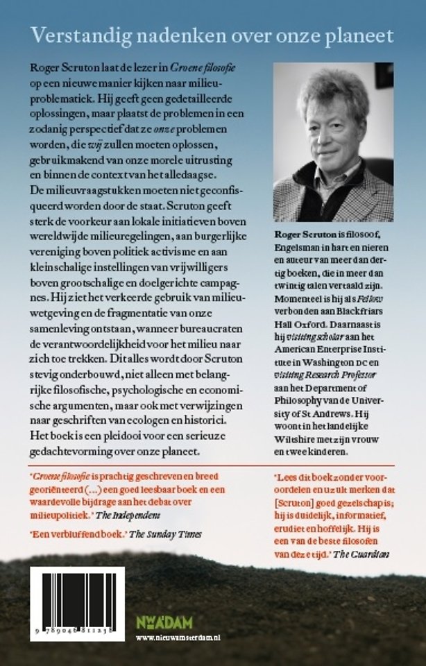 Roger Scruton laat de lezer in Groene filosofie op een nieuwe manier kijken naar milieuproblemen. Scruton geeft geen gedetailleerde oplossingen voor specifieke milieuproblemen, maar plaatst de problemen in een zodanig perspectief dat ze onze problemen worden, die wij zullen moeten oplossen, gebruikmakend van onze morele uitrusting en in onze alledaagse omstandigheden. De milieuproblemen moeten niet worden geconfisqueerd door de staat. De taak van de overheid is het creëren van de omstandigheden waarin het juiste motief voor oplossingen door ons gevonden en uitgevoerd kan worden. Scruton verdedigt lokale initiatieven boven wereldwijde milieuregelingen, burgerlijke vereniging tegen politiek activisme en kleinschalige instellingen van vriendschap tegen grootschalige en doelgerichte campagnes. Hij ziet het verkeerde gebruik van milieuwetgeving en de fragmentatie van onze samenleving ontstaan, wanneer de bureaucraten verantwoordelijkheid nemen voor het milieu. Dit alles wordt door Scruton onderbouwd door verwijzingen naar filosofie, psychologie en economie, alsook naar geschriften van ecologen en historici.