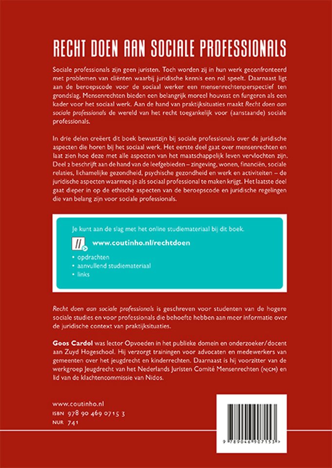 Sociale professionals zijn geen juristen maar worden in hun werk wel geconfronteerd met problemen van cliënten waarbij juridische kennis een rol speelt. Daarnaast ligt aan de Beroepscode voor de sociaal werker een mensenrechtenperspectief ten grondslag. Mensenrechten bieden een belangrijk moreel houvast en fungeren als een kader voor het sociaal werk. Aan de hand van praktijksituaties maakt Recht doen aan sociale professionals de wereld van het recht toegankelijk voor (aanstaande) sociale professionals.