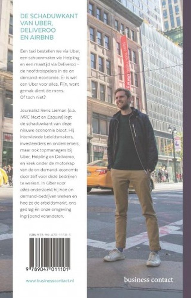 Lieman legt de schaduwkant van deze nieuwe economie bloot. Hij interviewde beleidsmakers, investeerders en ondernemers, maar ook topmanagers bij Uber, Helpling en Deliveroo, en keek onder de motorkap van de on demand-economie door zelf voor deze bedrijven te werken. In ‘Uber voor alles’ onderzoekt hij hoe on demand-bedrijven werken en hoe ze de arbeidsmarkt, ons gedrag én onze omgeving ingrijpend veranderen.