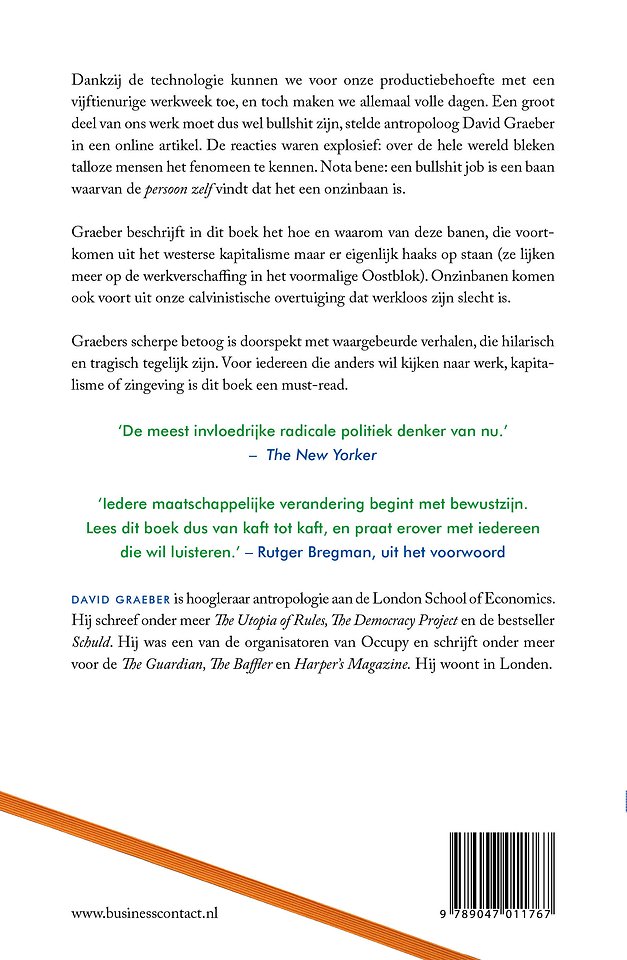 Meer over David GraeberIn ‘Bullshit jobs’ stelt antropoloog en invloedrijk denker David Graeber dat een groot deel van ons werk zinloos moet zijn. Want dankzij de technologie kunnen we voor onze productiebehoefte met een vijftienurige werkweek toe, en toch maken we allemaal nog steeds volle dagen. Hij kreeg op een blog hierover duizenden reacties: over de hele wereld blijken veel mensen het fenomeen te kennen. Nota bene: een bullshit job is een baan waarvan de persoon zelf vindt dat het (deels) een onzinbaan is.