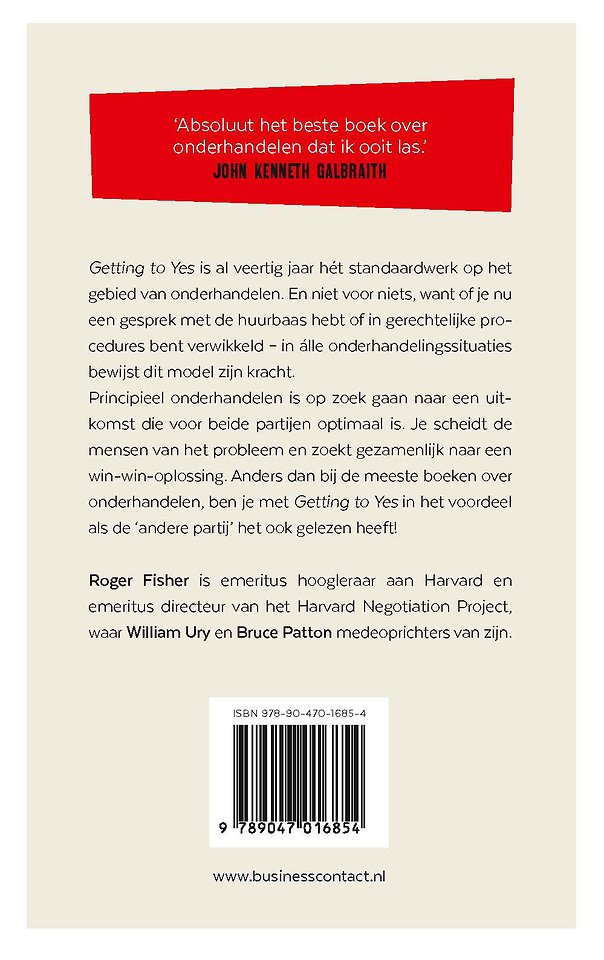 'Getting to Yes' van Roger Fisher, William Ury en Bruce Patton is al veertig jaar hét standaardwerk op het gebied van onderhandelen. En niet voor niets, want of je nu een gesprek met de huurbaas hebt of in gerechtelijke procedures bent verwikkeld – in álle onderhandelingssituaties bewijst dit model zijn kracht.