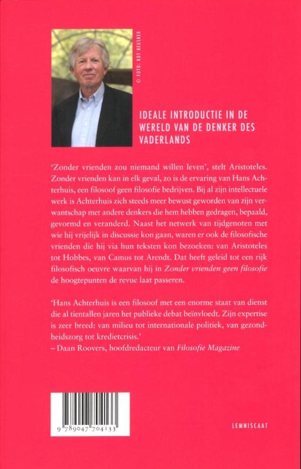 Achterhuis is zijn leven lang in staat geweest om vruchtbare discussies aan te gaan met anderen en ook, waar nodig, tegen zichzelf in te denken. Dat heeft geleid tot een rijk filosofisch oeuvre waarvan hij in 'Zonder vrienden geen filosofie' de hoogtepunten de revue laat passeren. Vanuit zijn eigen persoonlijke perspectief bespreekt hij boeken als De markt van welzijn en geluk, Het rijk van de schaarste, Met alle geweld en De utopie van de vrije markt. Daarmee is dit handzame essay een ideale introductie in de wereld van de Denker des Vaderlands.