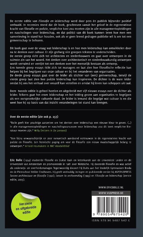 Meer over Eric BolleDe eerste editie van 'Filosofie en leiderschap' werd door pers én publiek bijzonder positief onthaald. In recensies stond dat dit boek, geschreven vanuit het geloof in de regeneratieve kracht van filosofie en poëzie, verplichte kost zou moeten zijn in alle managementopleidingen en nascholingen voor leiderschap, en dat politici van dit boek kunnen leren hoe men een samenleving in stand kan houden, ook als er geen breed gedragen publieke wil is om tot een gemeenschap te behoren.