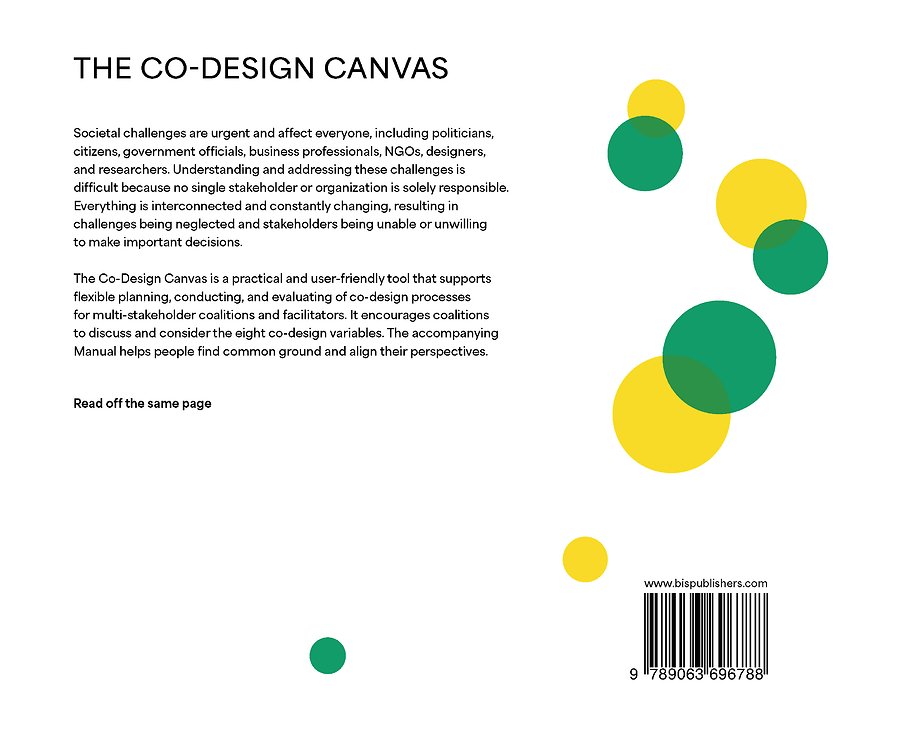 Everything is interconnected and constantly changing, resulting in challenges being neglected and stakeholders being unable or unwilling to make important decisions. The Co-Design Canvas is a practical and user-friendly tool that supports flexible planning, conducting, and evaluating of co-design processes for multi-stakeholder coalitions and facilitators. It encourages coalitions to discuss and consider eight co-design variables. The accompanying manual helps people find common ground and align their perspectives.