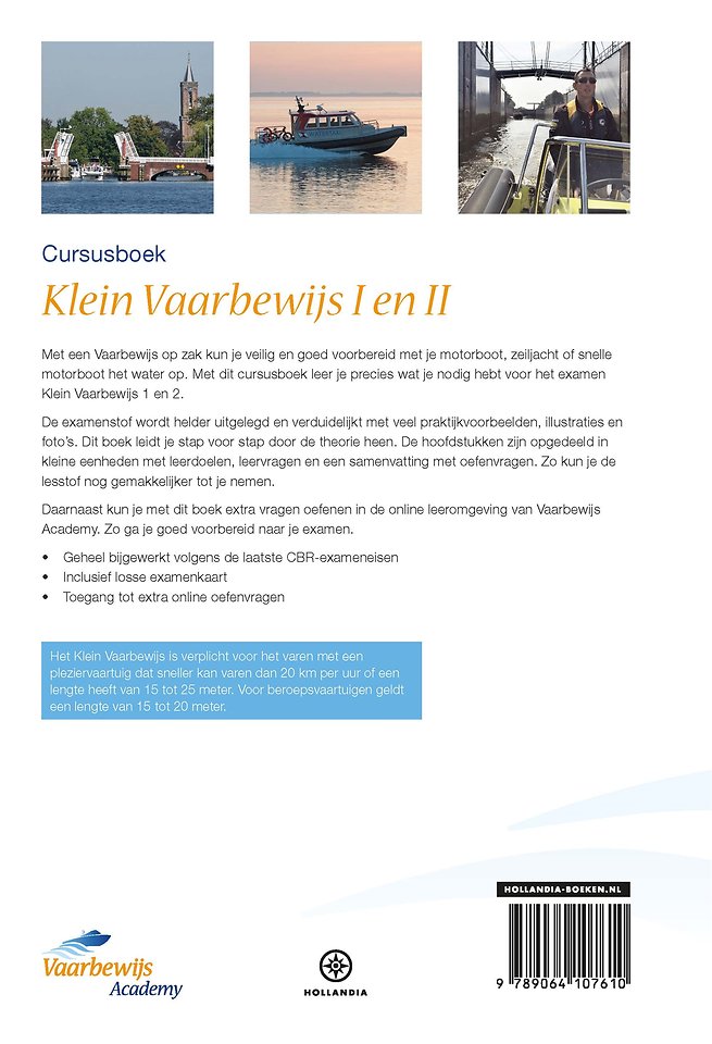 Met een vaarbewijs op zak kun je veilig en goed voorbereid met je motorboot, zeiljacht of snelle motorboot het water op. Met dit Vaarbewijs Academy cursusboek leer je precies wat je nodig hebt voor het examen Klein Vaarbewijs 1 (KVB1) en 2 (KVB2). De examenstof wordt helder uitgelegd en verduidelijkt met veel praktijkvoorbeelden, illustraties en foto's. Dit boek leidt je stap voor stap door de theorie heen. De hoofdstukken zijn opgedeeld in kleine eenheden met leerdoelen, leervragen en een samenvatting met oefenvragen. Zo kun je de lesstof nog gemakkelijker tot je nemen. Daarnaast kun je met dit boek extra vragen oefenen in de online leeromgeving van Vaarbewijs Academy. Zo ga je goed voorbereid naar je examen. Deze 7e druk is geheel bijgewerkt volgens de laatste CBR-exameneisen, heeft een losse examenkaart en geeft toegang tot extra online oefenvragen.