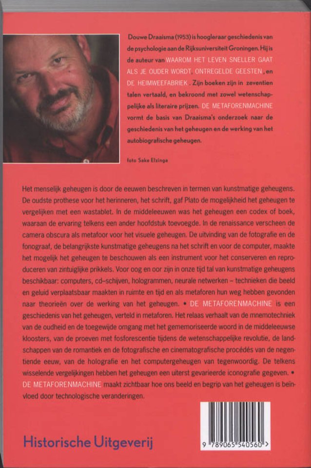 'De metaforenmachine' is een geschiedenis van het geheugen, verteld in metaforen. Het relaas verhaalt van de mnemotechniek van de oudheid en de toegewijde omgang met het gememoriseerde woord in de middeleeuwse kloosters, van de proeven met fosforescentie tijdens de wetenschappelijke revolutie, de landschappen van de romantiek en de fotografische en cinematografische procédés van de negentiende eeuw, van de holografie en het computergeheugen van tegenwoordig. De telkens wisselende vergelijkingen hebben het geheugen een uiterst gevarieerde iconografie gegeven.'De metaforenmachine' maakt zichtbaar hoe ons beeld en begrip van het geheugen is beïnvloed door technologische veranderingen.