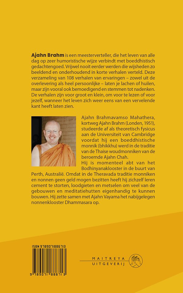 Ajahn Brahm is een meesterverteller, die het leven van alle dag op zeer humoristische wijze verbindt met boeddhistisch gedachtengoed. Vrijwel nooit eerder werden die wijsheden zo beeldend en onderhoudend in korte verhalen verteld. Deze verzameling van 108 verhalen van ervaringen – zowel uit de overlevering als heel persoonlijke – laten je lachen of huilen, maar zijn vooral ook bemoedigend en stemmen tot nadenken.