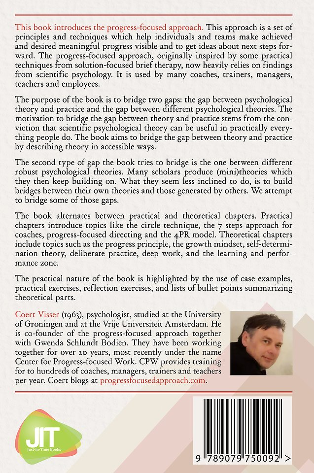 This book introduces the progress-focused approach. This approach is a set of principles and techniques which help individuals and teams make achieved and desired meaningful progress visible and to get ideas about next steps forward. The progress-focused approach, originally inspired by some practical techniques from solution-focused brief therapy, now heavily relies on findings from scientific psychology. It is used by many coaches, trainers, managers, teachers and employees.