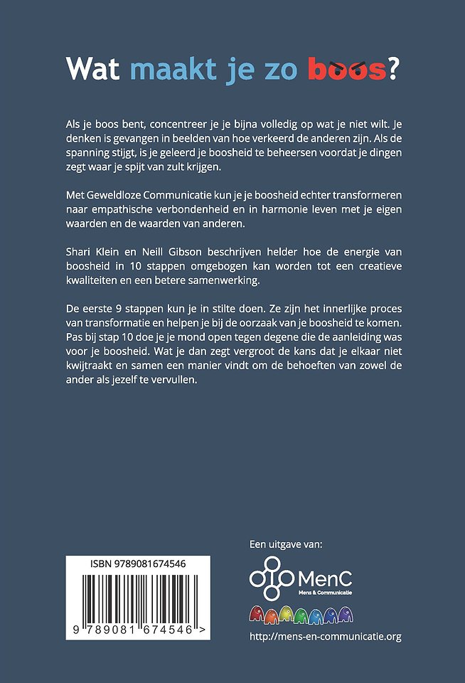 Raak vertrouwd met de 10 stappen om boosheid te transformeren naar een win-win situatie. Als u een raadgever bent op dit gebied, of trainingen geeft in omgaan met boosheid, dan zal dit boekje u een frisse benadering bieden en uw vaardigheden aanvullen. Dit boekje zal je helpen uw boosheid te transformeren naar compassievolle verbinding, oprechte communicatie en levenverrijkend handelen.
