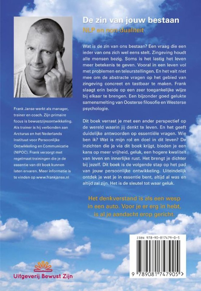 Wat is de zin van ons bestaan? Een vraag die een ieder van ons zich wel eens stelt. Zingeving houdt alle mensen bezig. Soms is het lastig het leven meer betekenis te geven. Vooral in een leven vol met problemen en teleurstellingen. En het valt niet mee om de abstracte vragen op het gebied van zingeving concreet en tastbaar te maken. Frank slaagt erin beide op een zeer toegankelijke wijze bij elkaar te brengen.