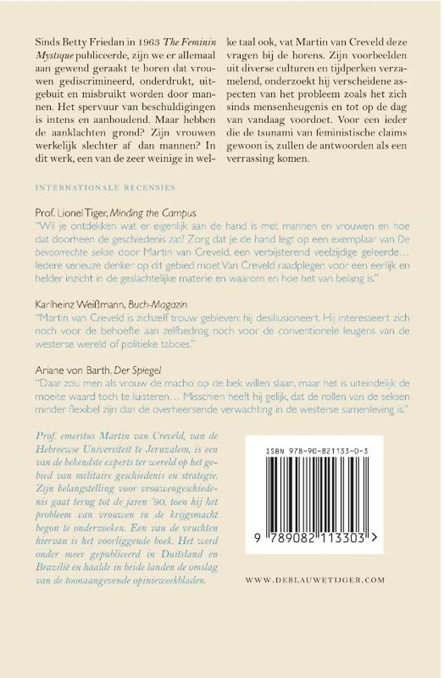 Sinds Betty Friedan in 1963 The Feminin Mystique publiceerde, zijn we er allemaal aan gewend geraakt te horen dat vrouwen gediscrimineerd, onderdrukt, uitgebuit en misbruikt worden door mannen. Het spervuur van beschuldigingen is intens en aanhoudend. Maar hebben de aanklachten grond? Zijn vrouwen werkelijk slechter af dan mannen? In dit werk, een van de zeer weinige in welke taal ook, vat Martin van Creveld deze vragen bij de horens. Zijn voorbeelden uit diverse culturen en tijdperken verzamelend, onderzoekt hij verscheidene aspecten van het probleem zoals het zich sinds mensenheugenis en tot op de dag van vandaag voordoet. Voor een ieder die de tsunami van feministische claims gewend is, zullen de antwoorden als een verrassing komen.