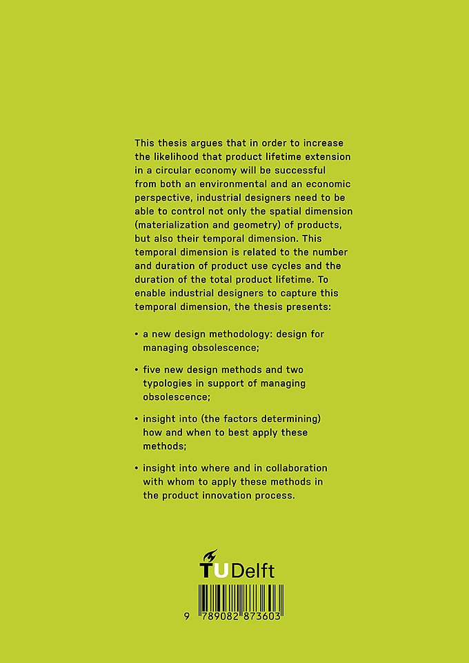 This thesis argues that in order to increase the likelihood that product lifetime extension in a circular economy will be successful from both an environmental and an economic perspective, industrial designers need to be able to control not only the spatial dimension (materialization and geometry) of products, but also their temporal dimension. This temporal dimension is related to the number and duration of product use cycles and the duration of the total product lifetime. To enable industrial designers to capture this temporal dimension, the thesis presents: