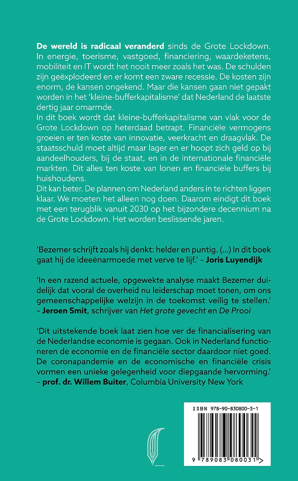 Meer over Dirk BezemerDe wereld is radicaal veranderd sinds de Grote Lockdown. In energie, toerisme, vastgoed, financiering, waardeketens, mobiliteit en it wordt het nooit meer zoals het was. De schulden zijn geëxplodeerd en er komt een zware recessie. De kosten zijn enorm, de kansen ongekend. Maar die kansen gaan niet gepakt worden in het 'kleine-bufferkapitalisme' dat Nederland de laatste dertig jaar omarmde.