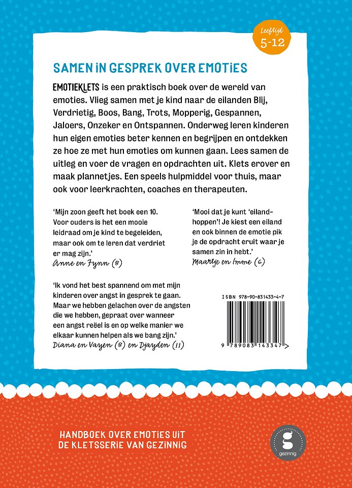 Kind en ouder/begeleider gaan samen aan de slag. Deel 1 is om (voor) te lezen, met als belangrijkste boodschap: alle emoties mogen er zijn. Deel 2 bevat vragen en opdrachten waardoor een kind zijn eigen emoties beter leert kennen. Vlieg samen naar de eilanden Blij, Verdrietig, Boos, Bang, Trots, Mopperig, Gespannen, Jaloers, Onzeker en Ontspannen. Lees de uitleg en voer de vragen en opdrachten uit. Het boek staat vol ideetjes en tips voor moeilijke momenten. Het kind kan – met hulp van ouders of begeleiders – uitproberen wat werkt, en zo een persoonlijke gebruiksaanwijzing maken. In deel 3 staan hulpkaarten om in te vullen. Emotieklets is geschikt voor thuis, maar ook voor leerkrachten, coaches en therapeuten.