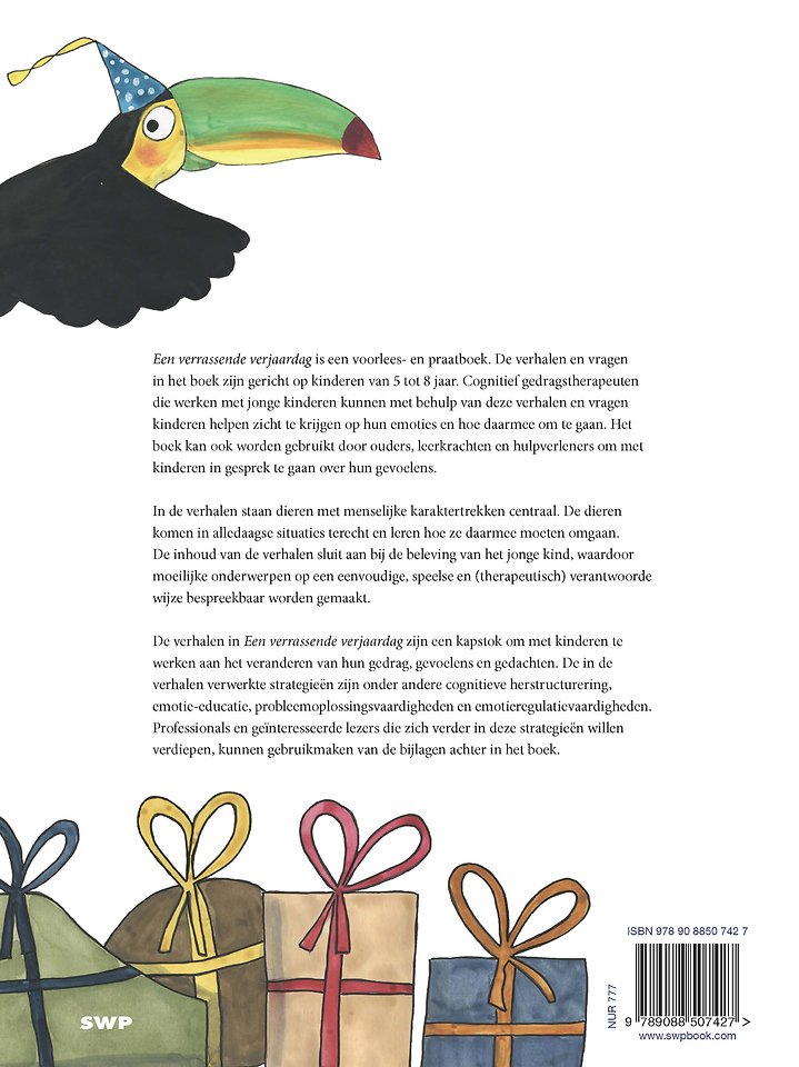 Een verrassende verjaardag is een voorlees- en praatboek. De verhalen en vragen in het boek zijn gericht op kinderen van 5 tot 8 jaar. Cognitief gedragstherapeuten die werken met jonge kinderen kunnen met behulp van deze verhalen en vragen kinderen helpen zicht te krijgen op hun emoties en hoe daarmee om te gaan. Het boek kan ook worden gebruikt door ouders, leerkrachten en hulpverleners om met kinderen in gesprek te gaan over hun gevoelens.