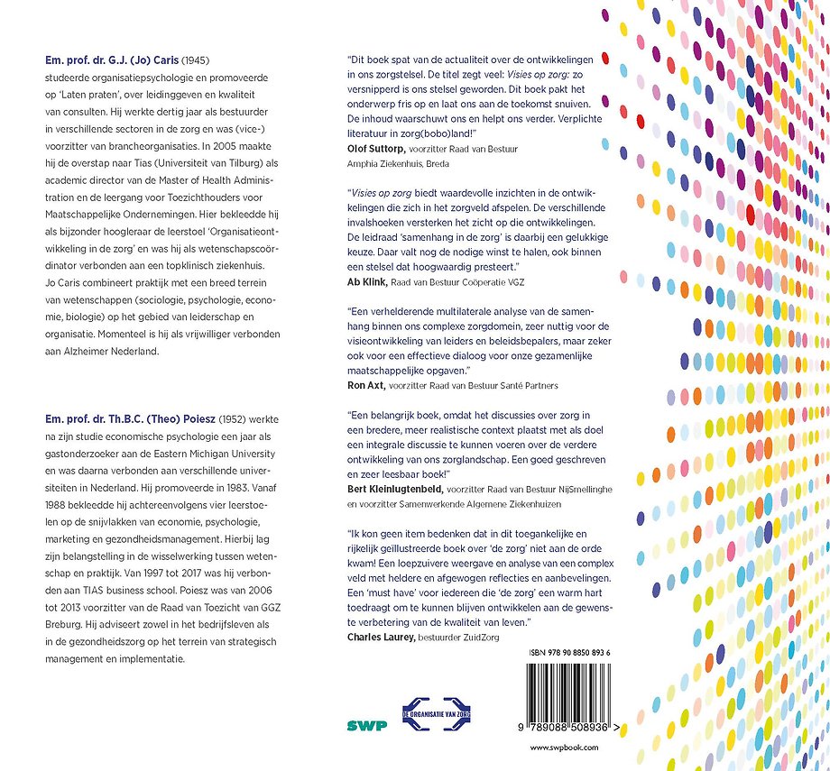 In Visies op zorg geven Jo Caris en Theo Poiesz strategische analyses van verschillende aspecten en onderdelen van de zorgsector - overigens zonder de pretentie van volledigheid. De brede en diepgaande perspectieven bieden overzicht en inzicht voor professionals, beleidsmakers en geïnteresseerden ten behoeve van beleidsontwikkeling, beschouwingen of besluitvorming over onderwerpen en processen binnen de zorg.