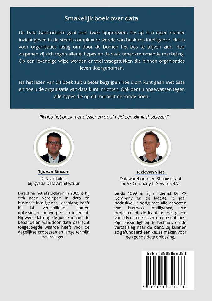 De Data Gastronoom gaat over twee fijnproevers die op hun eigen manier inzicht geven in de steeds complexere wereld van business intelligence. Het is voor organisaties lastig om door de bomen het bos te blijven zien. Hoe wapenen zij zich tegen allerlei hypes en de vaak tenenkrommende marketing. Op een levendige wijze worden er veel vraagstukken die binnen organisaties leven doorgenomen.