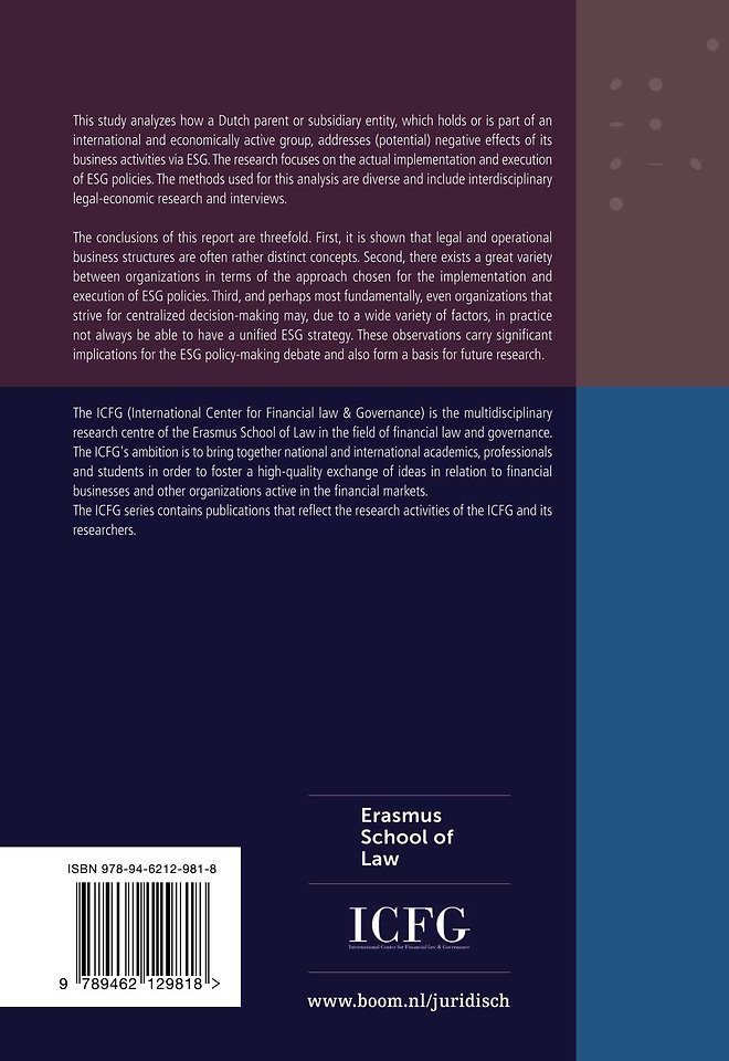 This study analyzes how a Dutch parent or subsidiary entity, which holds or is part of an international and economically active group, addresses (potential) negative effects of its business activities via ESG. The research focuses on the actual implementation and execution of ESG policies. The methods used for this analysis are diverse and include interdisciplinary legal-economic research and interviews.