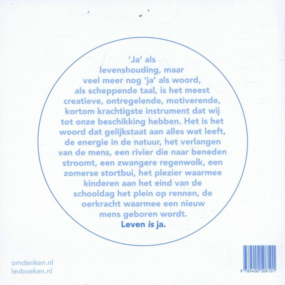 ‘Ja’ als levenshouding, maar veel meer nog ‘ja’ als woord, als scheppende taal, is het meest creatieve, ontregelende, motiverende, kortom krachtigste instrument dat wij tot onze beschikking hebben. Het is het woord dat gelijkstaat aan alles wat leeft, de energie in de natuur, het verlangen van de mens, een rivier die naar beneden stroomt, een zwangere regenwolk, een zomerse stortbui, het plezier waarmee kinderen aan het eind van een schooldag een plein op rennen, de oerkracht waarmee een nieuw mens geboren wordt.