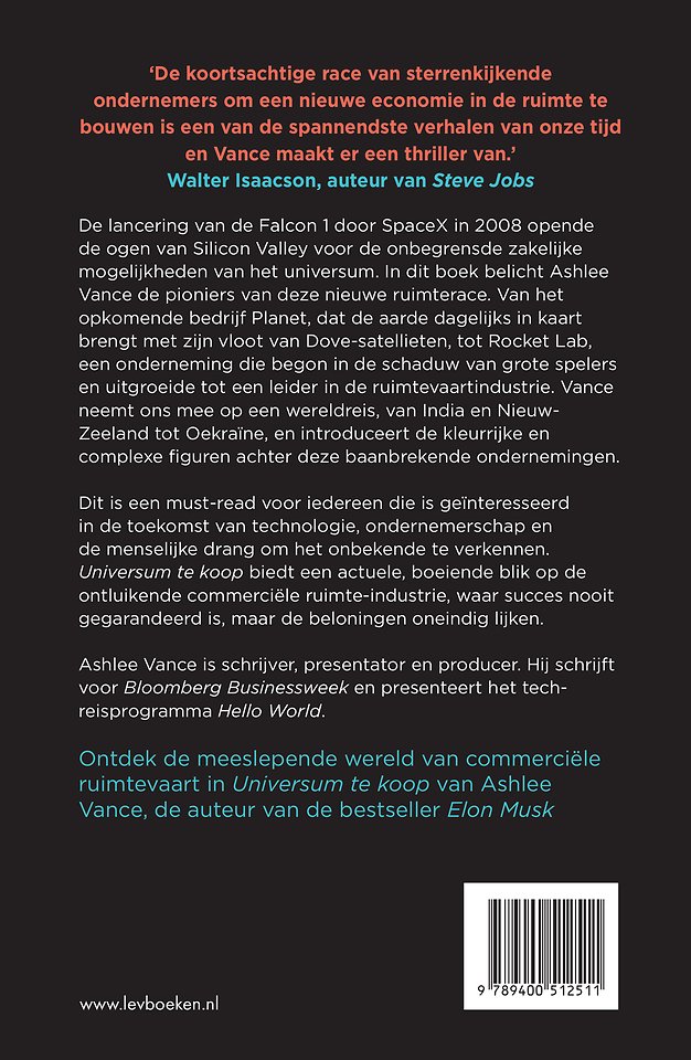 De koortsachtige race van sterrenkijkende ondernemers om een nieuwe economie in de ruimte te bouwen is een van de spannendste verhalen van onze tijd en Vance maakt er een thriller van. - Walter Isaacson, auteur van ‘Steve Jobs’