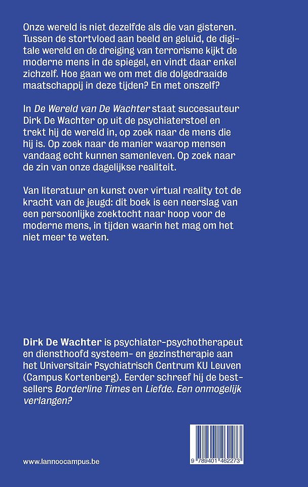 In 'De Wereld van De Wachter' staat succesauteur Dirk De Wachter op uit de psychiaterstoel en trekt hij de wereld in, op zoek naar de mens die hij is. Op zoek naar de manier waarop mensen vandaag echt kunnen samenleven. Op zoek naar de zin van onze dagelijkse realiteit.