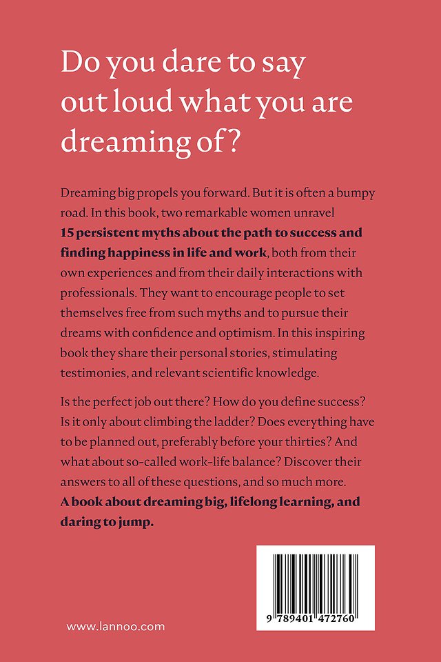 Meer over de auteursDreaming big propels you forward. But it is often a bumpy road. In this book, two remarkable women unravel 15 persistent myths about the path to success and finding happiness in life and work, both from their own experiences and from their daily interactions with professionals. They want to encourage people to set themselves free from such myths and to pursue their dreams with confidence and optimism. In this inspiring book they share their personal stories, stimulating testimonies, and relevant scientific knowledge.
