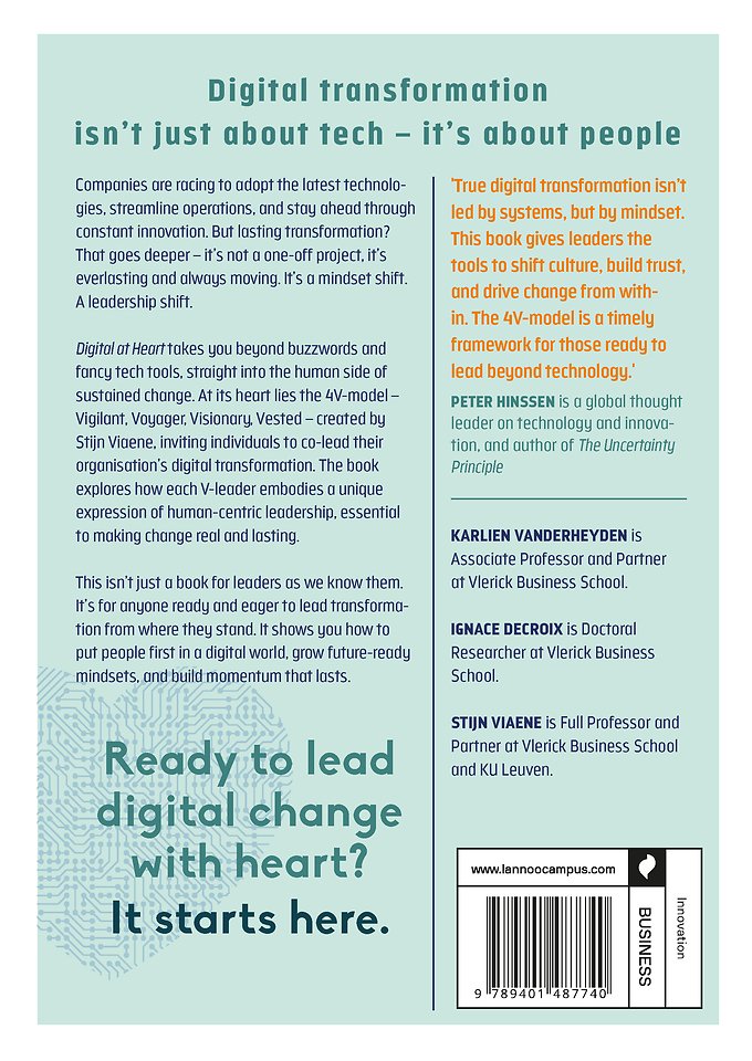 Digital at Heart takes you beyond buzzwords and fancy tech tools, straight into the human side of sustained change. At its heart lies the 4V-model - Vigilant, Voyager, Visionary, Vested - created by Stijn Viaene, inviting individuals to co-lead their organisation's digital transformation. The book explores how each V-leader embodies a unique expression of human-centric leadership, essential to making change real and lasting.