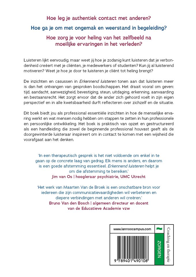 Maarten Van de Broek werkte als socio-emotioneel leerlingenbegeleider en is psychotherapeut met een eigen praktijk. Met zijn opleidingscentrum Vonk en Visie geeft hij In heel Vlaanderen zowel korte bijscholingen als langdurige opleidingen over begeleiding, motivatie, gesprekstechnieken. Erkennend luisteren is daarbij steeds het fundament.