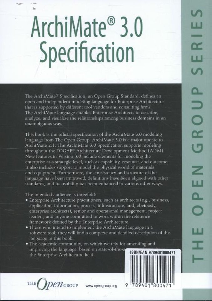This book is the official specification of the ArchiMate 3.0 modeling language from The Open Group. ArchiMate 3.0 is a major update to ArchiMate 2.1.The ArchiMate 3.0 Specification supports modeling throughout the TOGAF® Architecture Development Method (ADM). New features in Version 3.0 include elements for modeling the enterprise at a strategic level, such as capability, resource, and outcome. It also includes support to model the physical world of materials and equipment. Furthermore, the consistency and structure of the language have been improved, definitions have been aligned with other standards, and its usability has been enhanced in various other ways.