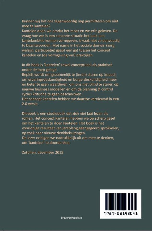 In dit boek is 'kantelen' zowel conceptueel als praktisch onder de loep gelegd. Bepleit wordt om gezamenlijk te (leren) sturen op impact, om ervaringsdeskundigheid en burgerdeskundigheid meer en beter te gaan waarderen, om ons niet blind te staren op nieuwe business modellen en om de planning & control cyclus kritische te gaan beschouwen. Het concept kantelen hebben we daartoe vernieuwd in een 2.0 versie.