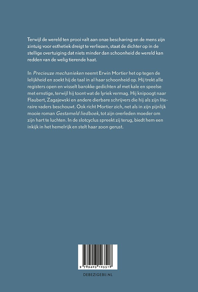 In Precieuze mechanieken neemt Erwin Mortier het op tegen de lelijkheid en zoekt hij de taal in al haar schoonheid op. Hij trekt alle registers open en wisselt barokke gedichten af met kale en speelse met ernstige, terwijl hij toont wat de lyriek vermag. Hij knipoogt naar Flaubert, Zagajewski en andere dierbare schrijvers die hij als zijn literaire vaders beschouwt. Ook richt Mortier zich, net als in zijn pijnlijk mooie roman Gestameld liedboek, tot zijn overleden moeder om zijn hart te luchten. In de slotcyclus spreekt zij terug, biedt hem een inkijk in het hemelrijk en stelt haar zoon gerust.