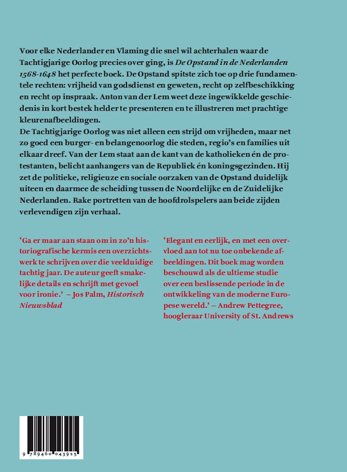 Voor elke Nederlander en Vlaming die in dit herdenkingsjaar snel wil achterhalen waar de Tachtigjarige Oorlog precies over ging, is dit het perfecte boek. De kern van de strijd lag in drie fundamentele rechten: vrijheid van godsdienst en geweten, recht op zelfbeschikking en recht op inspraak. Vanuit deze actualiteit weet Anton van der Lem een ingewikkelde geschiedenis in kort bestek helder te presenteren en te illustreren met prachtige afbeeldingen. Hij zet de ingewikkelde politieke, religieuze en sociale oorzaken van de Opstand duidelijk uiteen en daarmee de scheiding tussen de Noordelijke en de Zuidelijke Nederlanden. Rake portretten van de hoofdrolspelers aan beide zijden verlevendigen zijn verhaal. De schrijver staat aan de kant van de katholieken én de protestanten, belicht aanhangers van de Republiek én de koningsgezinden. Daarnaast was de Tachtigjarige Oorlog niet alleen een strijd om vrijheden, maar net zo goed een burger- en belangenoorlog die steden, regio’s en families uit elkaar dreef.